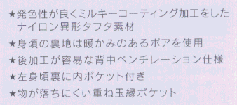 表地:ポリエステル100%(異形タフタ・撥水加工)