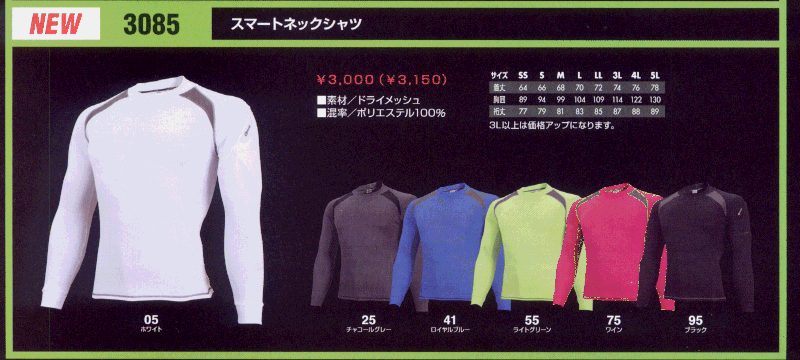 3085 スマートネックシャツ 税別¥1,500(3L以上は¥300UP)