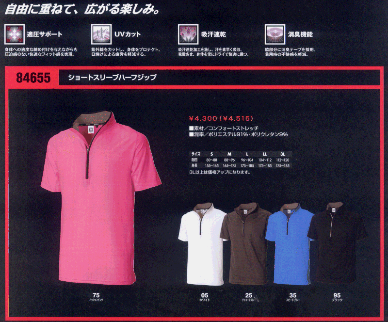 84655 ショートスリーブハーフジップ 税別¥2,150(3L以上は¥300UP)