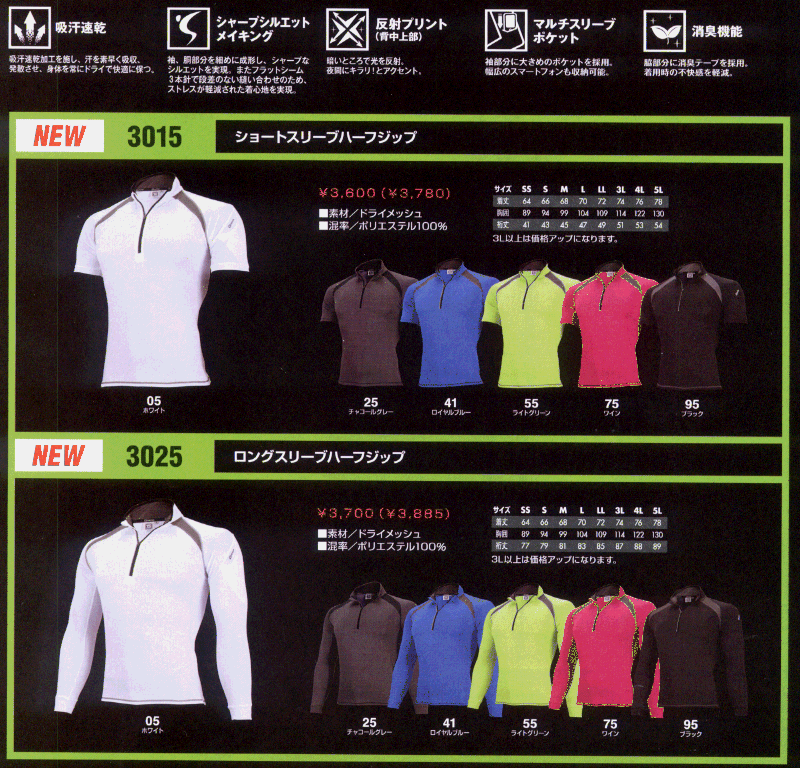 3025 ロングスリーブハーフジップ 税別¥1,850(3L以上は¥300UP)